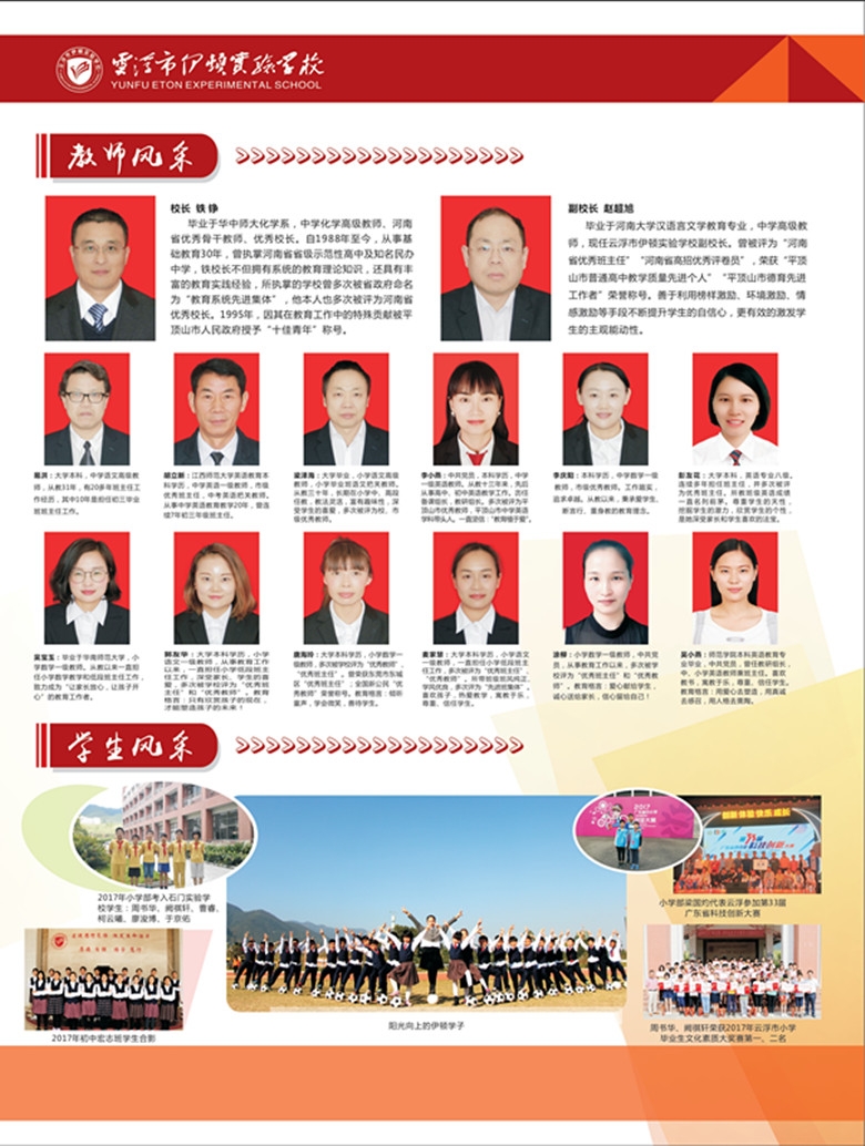 伊顿实验学校高中部定位高端,借鉴河北省衡水中学的办学成功模式并实现部分资源共享,依托河南省20所知名高中参加的“高考模拟大联考”进行学情分析和效果评价,致力于打造粤西北最优质的高级中学,为达到此目的,特面向全国招聘高中优秀教师,欢迎更多的教育英才加盟伊顿。