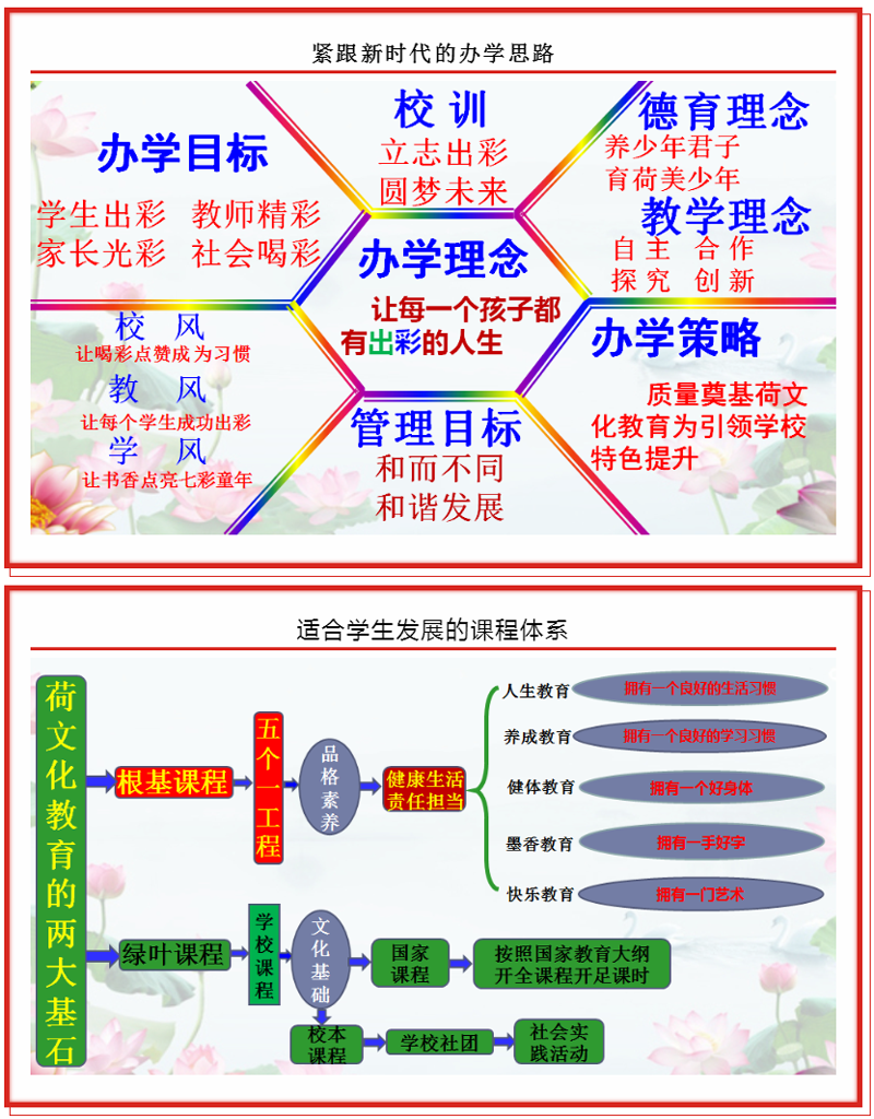 学校以让每一个孩子都有出彩的人生的办学理念开展工作,以构建学生出彩、教师精彩、家长光彩、社会喝彩可持续发展的办学目标,以立志出彩、圆梦未来为校训,并以质量奠基,荷文化教育为抓手。学校特色提升的工作体系,形成了让喝彩点赞成为习惯的良好校风,让每一个学生成功出彩的良好教风,让书香点亮七彩童年的良好学风。学校大力推进教育改革与创新,通过营造书香校园特色、英语特色、特长培养特色,培育了学生的美好品行,挖掘学生潜能,使学生的整体素质不断提高。全力打造国家基础课程、荷的绿叶课程、荷的根基课程