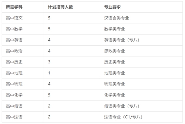 (1)统招本科及以上学历,持有高中教师资格证,教授学科与所学专业对口,应往届毕业均可;