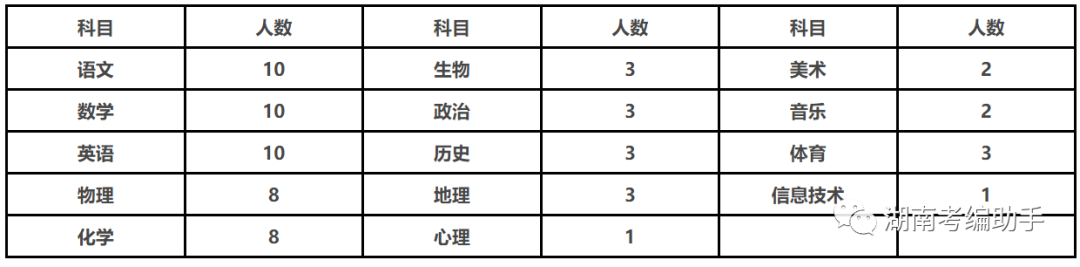 学校面向社会招聘高中语文、数学、英语、物理、化学、生物、政治、历史、地理、心理、美术、音乐、体育、信息技术各科教师,招聘人数如下: