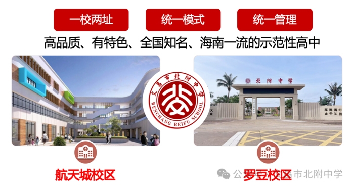 文昌市北附中学将构建“航天城校区+罗豆校区”一校两址的办学格局,实现南北联动、全域覆盖,形成资源共享、优势互补、协同发展的双校区格局,打造文昌区域内外影响力突出的名校。同时,学校将深化与北京大学、清华大学附中等优质教育资源的合作,打造科研型、创新型、开放型教育平台,并积极参与海南自贸港人才战略,为区域经济社会发展输送高素质人才。