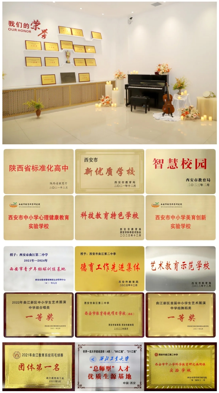 建校以来,学校先后被授予“西安市青少年排球训练基地”“西安市中小学心理健康实验学校”“西安市新优质成长学校”“西安市体育传统项目学校”“西安市思政教育教学实验学校”“西安市中小学智慧校园”“西安市艺术教育示范学校”“西安市普通高中优质学科基地”“西安市中小学美育创新实验校”“西安市德育工作先进集体”“西安市科技教育特色学校”“西安市中小学科学教育研究共同体实验学校”等荣誉称号。