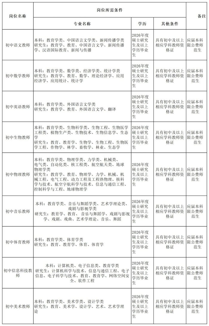 为进一步加强我校教师队伍建设,充实教师队伍力量,优化教师结构,拟对外公开招聘语文、数学、英语、物理、体育、生物、美术、音乐、信息技术学科教师,具体岗位如下: