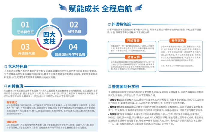 上海美达菲双语高级中学重点开设艺术特色班、AI特色班、外语特色班以及普高国际升学班。