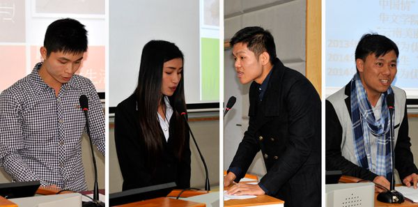 随后,“优秀学生”获奖代表缅甸留学生杨安鸿、“全勤生”获奖代表泰国留学生李乐云、 “进步生”获奖代表越南留学生河清辉和 “优秀学生干部”获奖代表缅甸留学生李正超分别发表获奖感言,与大家分享了自己的学习经验和感受,在表达对老师感谢的同时,也立志在今后的学习中会继续努力,争创好成绩。